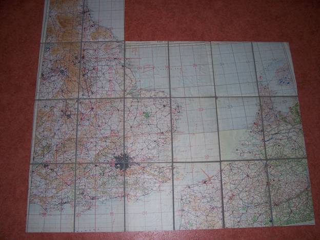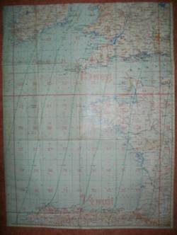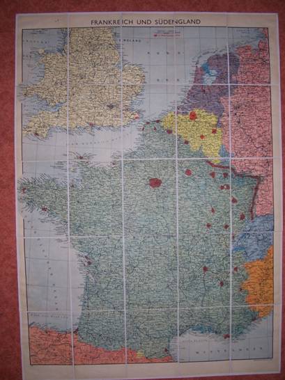 De kaart werd ook op papier uitgegeven, maar dan niet aan beide kanten bedrukt. Hieronder een exemplaar met rode lijnen, waarvan ik aanneem dat deze ook in de cockpit gebruikt werden. De rechterkaart van Duitsland kom je regelmatig tegen, maar heeft verder heel weinig gevens. Als iemand meer informatie over fliegerkarte heeft, hoor ik dit graag! stafkaart@caiway.net