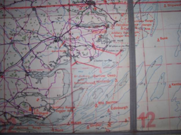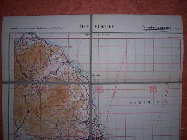 Op deze kaart zijn wel de Engelse kustverdediging aangegeven. Met rood potlood is tevens een aantal strepen gezet waartussen de vliegtuigen ‘veilig’ konden vliegen. Op deze kaart staat de Engelse kustverdediging en dat is vrij uniek!