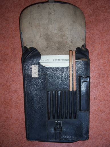 De Duitse kaarttas is er in een bruine en zwarte uitvoering. Zelf heb ik een zwarte die ik nog in het gulden tijdperk heb gekocht in die dump in Antwerpen aan dat pleintje. Het is een ongestempeld exemplaar met waarvan het leertje ontbreekt dat de gummetje in het opbergvakje houd. De lineaal en potloden kwam ik jaren later tegen.